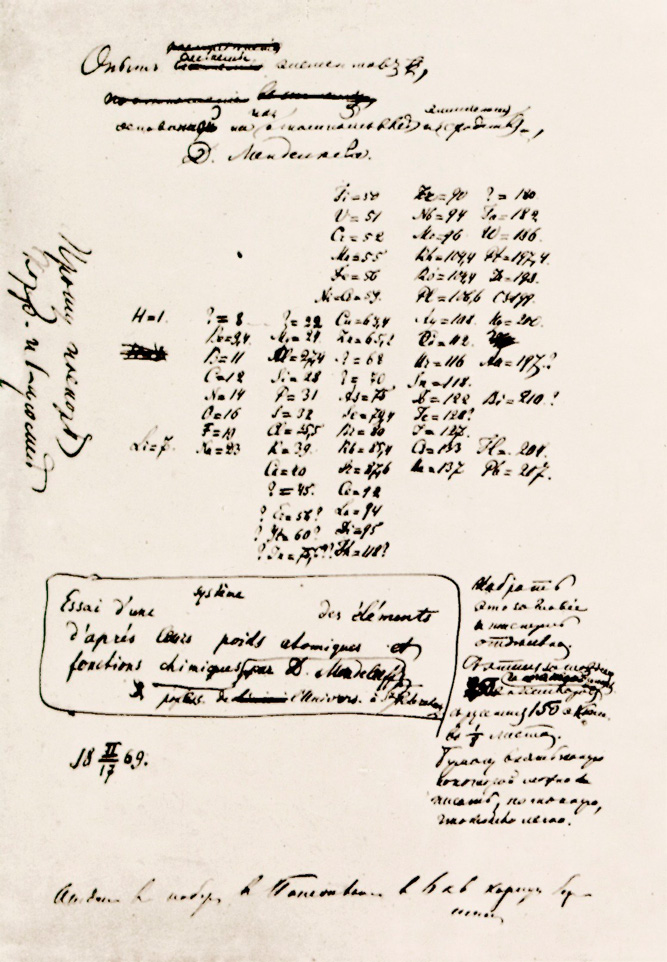 1869. Primera versión de la tabla periódica del ruso Dimitri Mendelèiev basada en los pesos atómicos, dos años más tarde se publica en ruso de los Principios de química de Mendelèiev, que incluyen su tabla periódica. El 1 de marzo de 2019 se conmemora el 150 aniversario.