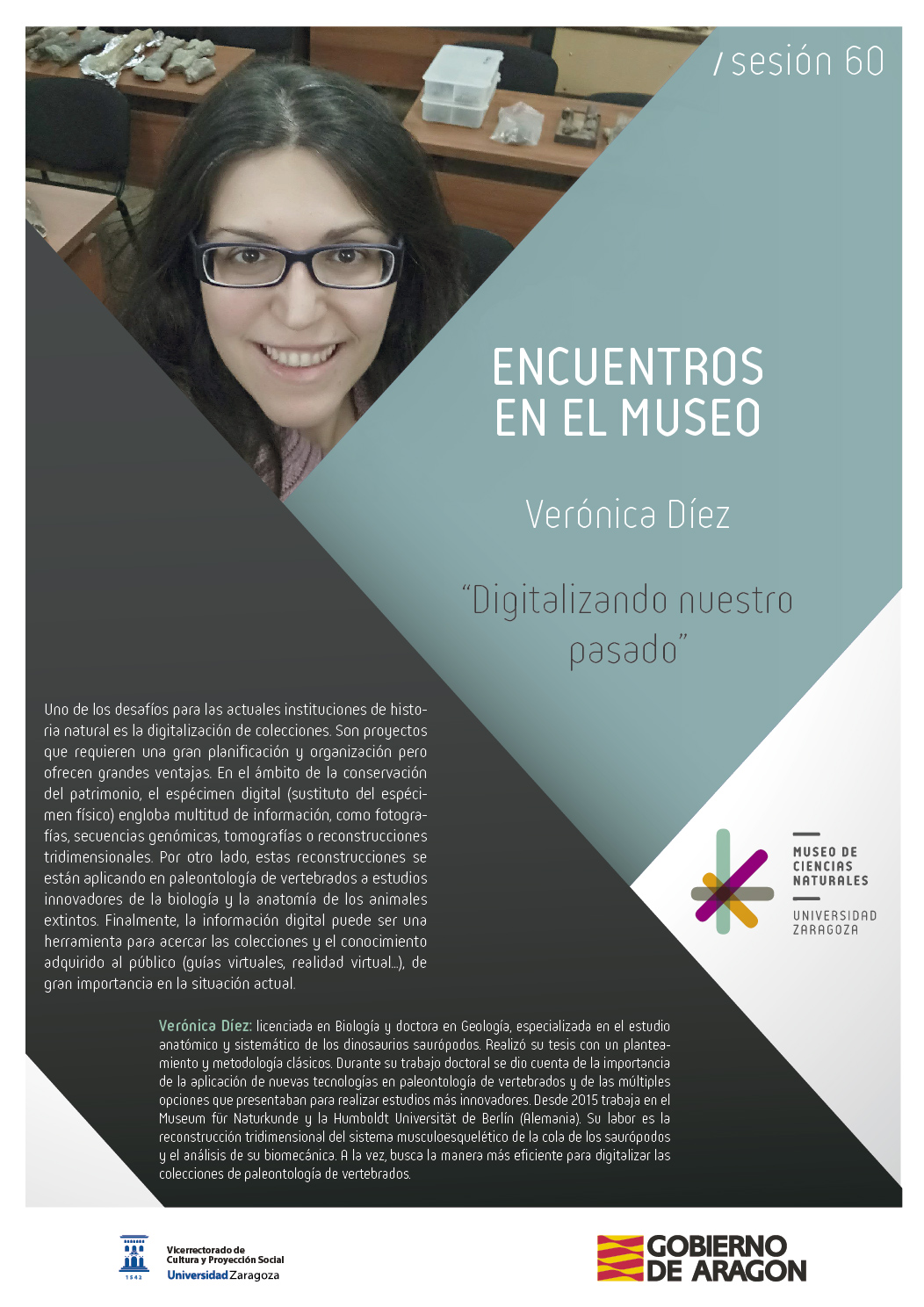 Verónica Díez Díaz es licenciada en Biología y doctora en Geología, especializada en el estudio anatómico y sistemático de los dinosaurios saurópodos. Realizó su tesis con un planteamiento y metodología clásicos. Durante su trabajo doctoral se dio cuenta de la importancia de la aplicación de nuevas tecnologías en paleontología de vertebrados y de las múltiples opciones que presentaban para realizar estudios más innovadores. Desde 2015 trabaja en el Museum für Naturkunde y la Humboldt Universität de Berlín (Alemania). Su labor es la reconstrucción tridimensional del sistema musculoesquelético de la cola de los saurópodos y el análisis de su biomecánica. A la vez, busca la manera más eficiente para digitalizar las colecciones de paleontología de vertebrados.