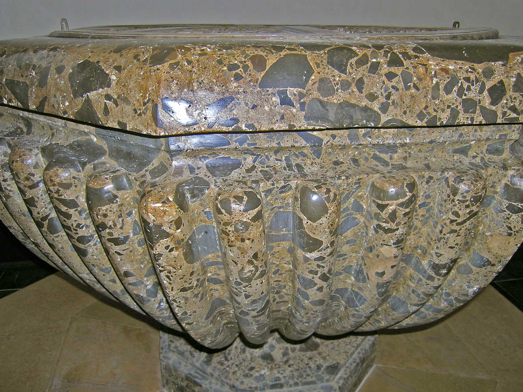 Quizá menos conocida para el público general sea la explotación de áridos para la construcción. Entre nuestras historias hemos rescatado la de varios tipos de roca ornamental, muy apreciados, obtenidos en canteras de la provincia de Zaragoza. Un ejemplo es el denominado “jaspe de Ricla”, con el que se han construido las pilas bautismales de numerosas iglesias y catedrales de todo Aragón (en la imagen, la pila bautismal de la catedral de Tarazona). A pesar de su nombre, no es un jaspe sino una roca de tipo brecha, de formación relativamente reciente, compuesta por fragmentos (o clastos) de gran tamaño de calizas negras. Otro ejemplo es la “piedra de Codos”, que muchos zaragozanos conoceréis por ser la roca de color oscuro en la que se construyó el Monumento al Justicia de Aragón. Esta roca llamó la atención del arquitecto Félix Navarro por sus remarcables propiedades: se trata de un pórfido diorítico verde con una elevada densidad. Por último, la “piedra caracoleña” es un tipo de caliza bioconstruida de gran belleza. Se extraía en canteras de la zona de Fuendetodos, y ha sido utilizada como roca ornamental en construcciones tan famosas como El Puente de Piedra de Zaragoza. Llama la atención, sobre todo, por los caparazones de gasterópodos que la conforman y que le dan ese aspecto poroso que es parte de su atractivo.