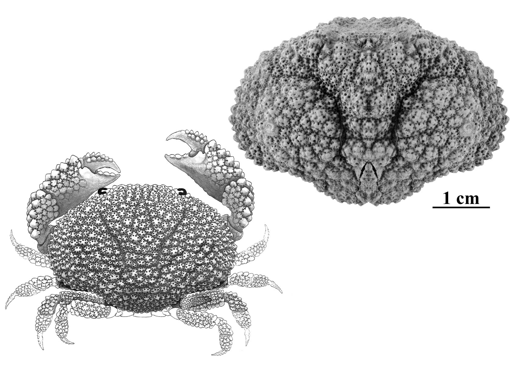 Fósil y reconstrucción de uno de los nuevos cangrejos, bautizado como Daira corallina.