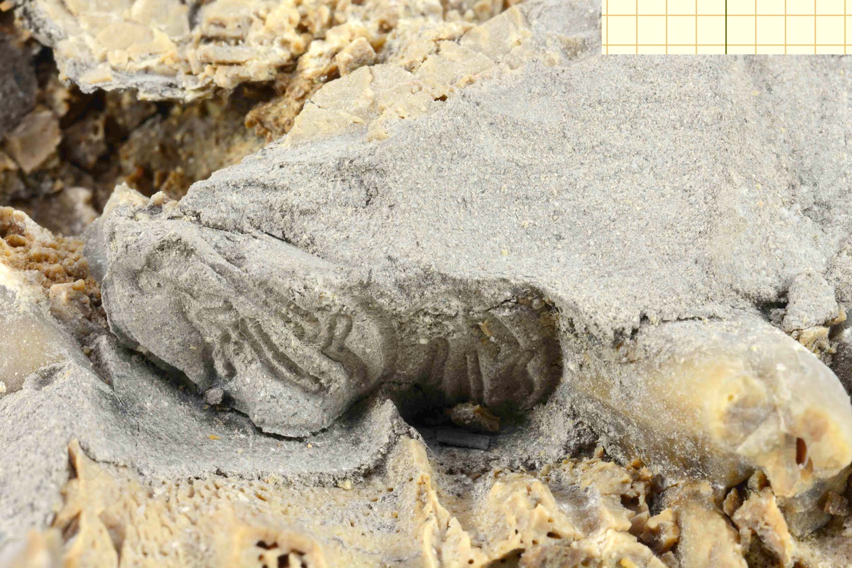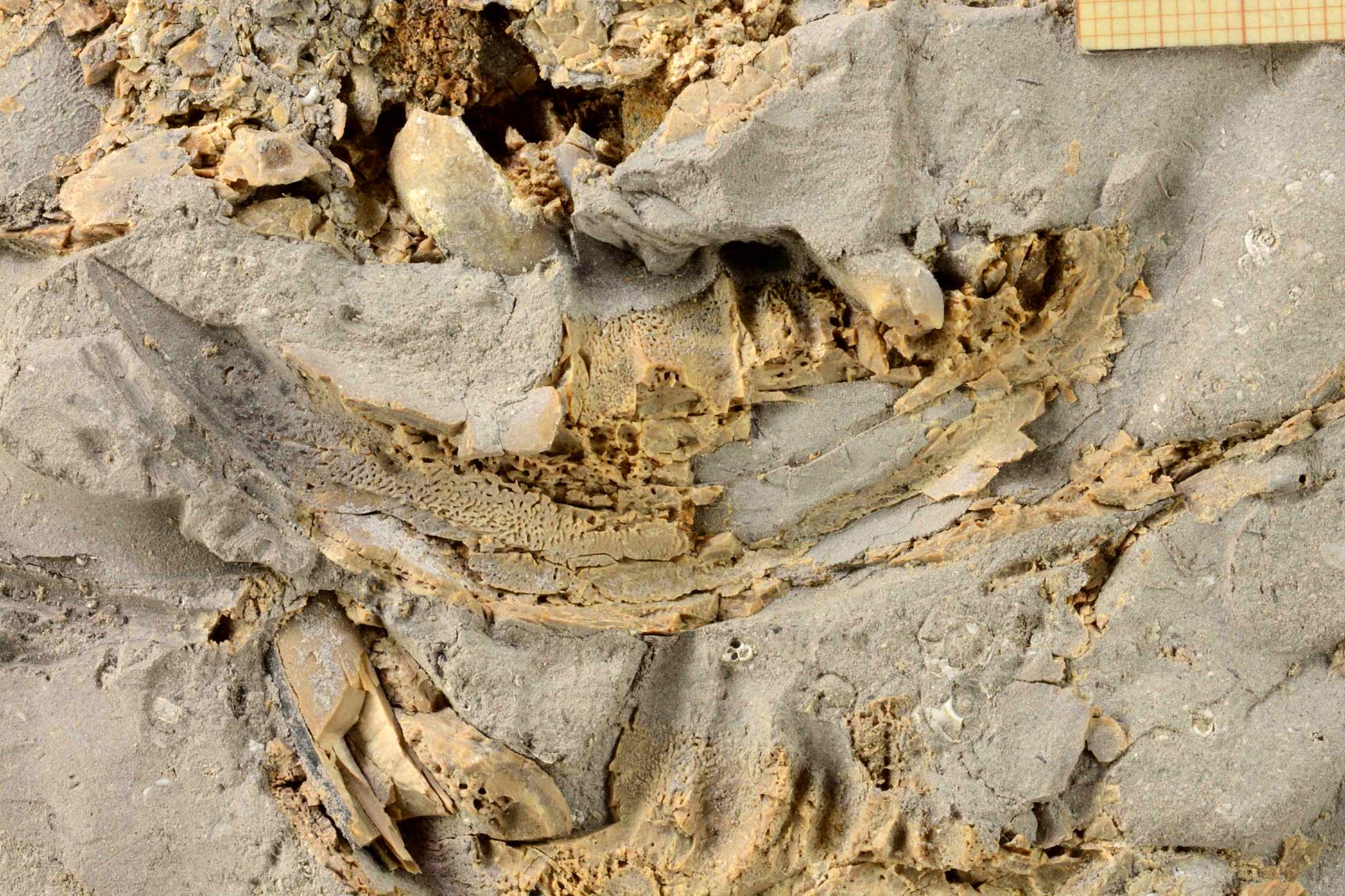 Os mostramos también una foto de detalle de la zona inferior del cráneo, que sería el molde de la mandíbula donde se ve el incisivo típico de un roedor. En otra fotografía se ve el molde que hizo uno de los molares en la matriz que lo rodeaba. A pesar de faltar el molar, se puede ver en el molde la morfología que tendría la superficie de masticación del diente.