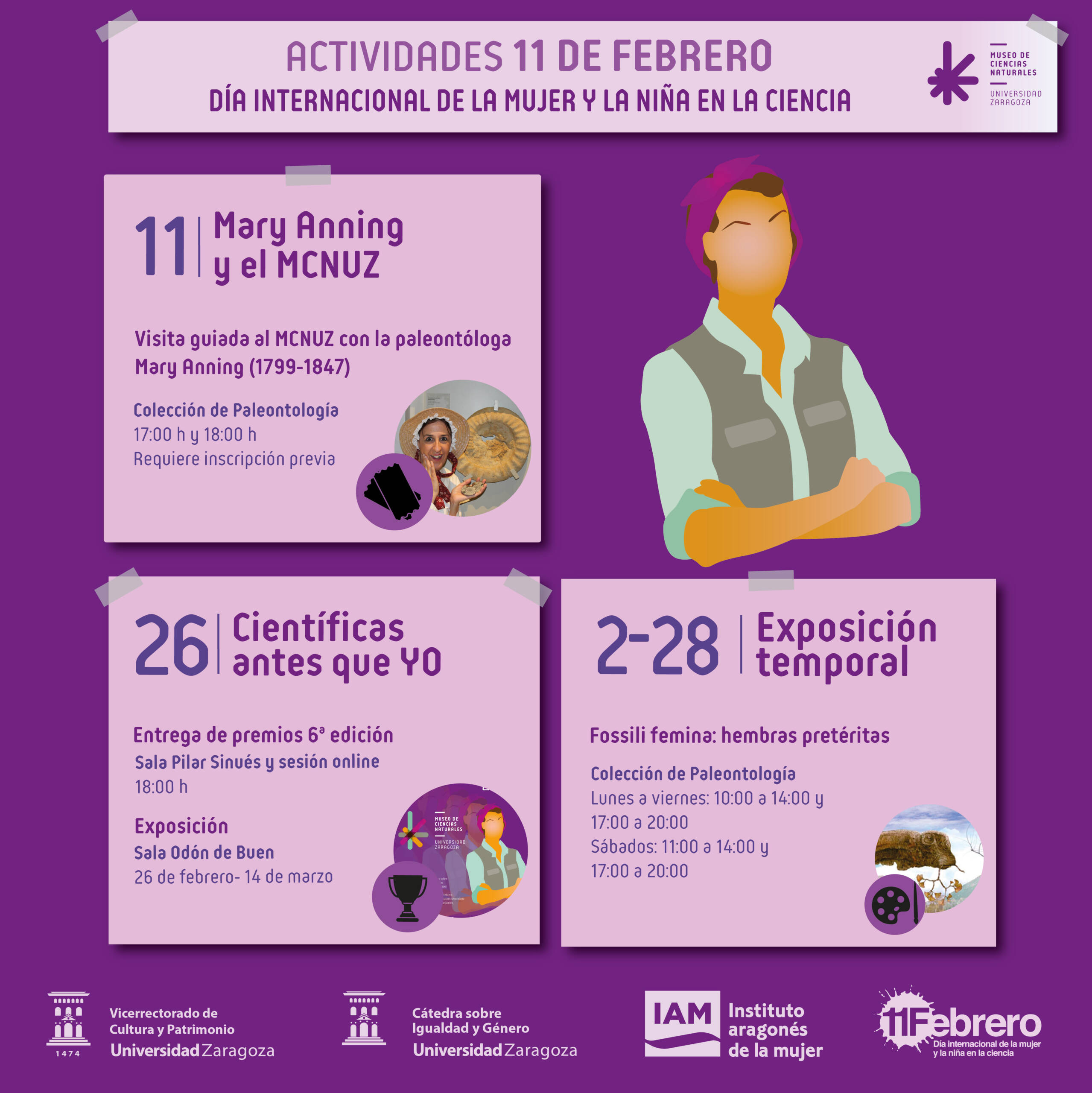 El 11 de febrero se celebra el Día Internacional de la Mujer y la Niña en la Ciencia, una fecha proclamada por la Asamblea General de las Naciones Unidas (ONU) para visibilizar la contribución de las mujeres a los avances científicos y tecnológicos, y para fomentar la igualdad de oportunidades en este ámbito. A través de este ciclo, desde el MCNUZ deseamos sumarnos a esta iniciativa global, destacando la importancia de las científicas en la construcción del conocimiento y reflexionando sobre los retos que aún persisten en la actualidad. Te invitamos a celebrar con nosotros esta jornada tan especial asistiendo a las distintas actividades de acceso libre y gratuito que planteamos a lo largo del mes.