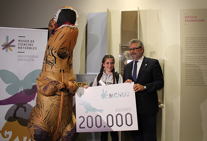 Desde su inauguración el 11 de diciembre de 2015, el Museo de Ciencias Naturales de la Universidad de Zaragoza no ha dejado de recibir visitas. Hoy, día 8 de noviembre de 2019, estamos de celebración. La estudiante de 4º de la ESO Almudena Gregorio, del colegio Santa Ana de Calatayud, ha sido la visitante 200.000 de la exposición permanente del Museo, situada en el Paraninfo de la Universidad. El Rector de la Universidad le ha hecho entrega de unos regalos y un documento acreditativo en un sencillo acto celebrado en el mismo Paraninfo.