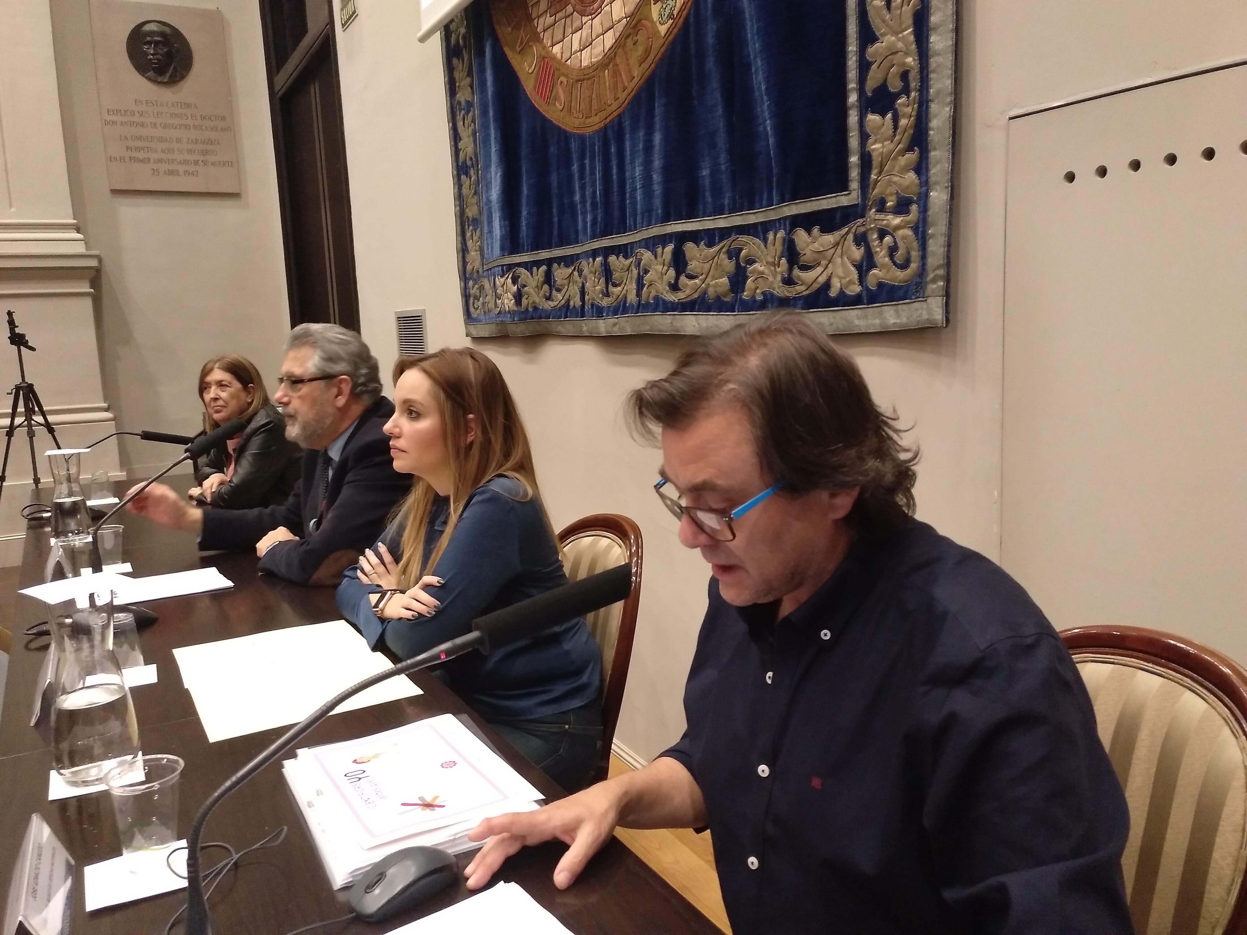 De izquierda a derecha: la Vicerrectora de Cultura y Proyección Social Yolanda Polo, el Rector de la Universidad de Zaragoza José Antonio Mayoral, la Consejera de Ciencia, Universidad y Sociedad del Conocimiento, María Eugenia Díaz y el Director del Museo de Ciencias Naturales de la Universidad de Zaragoza, José Ignacio Canudo.