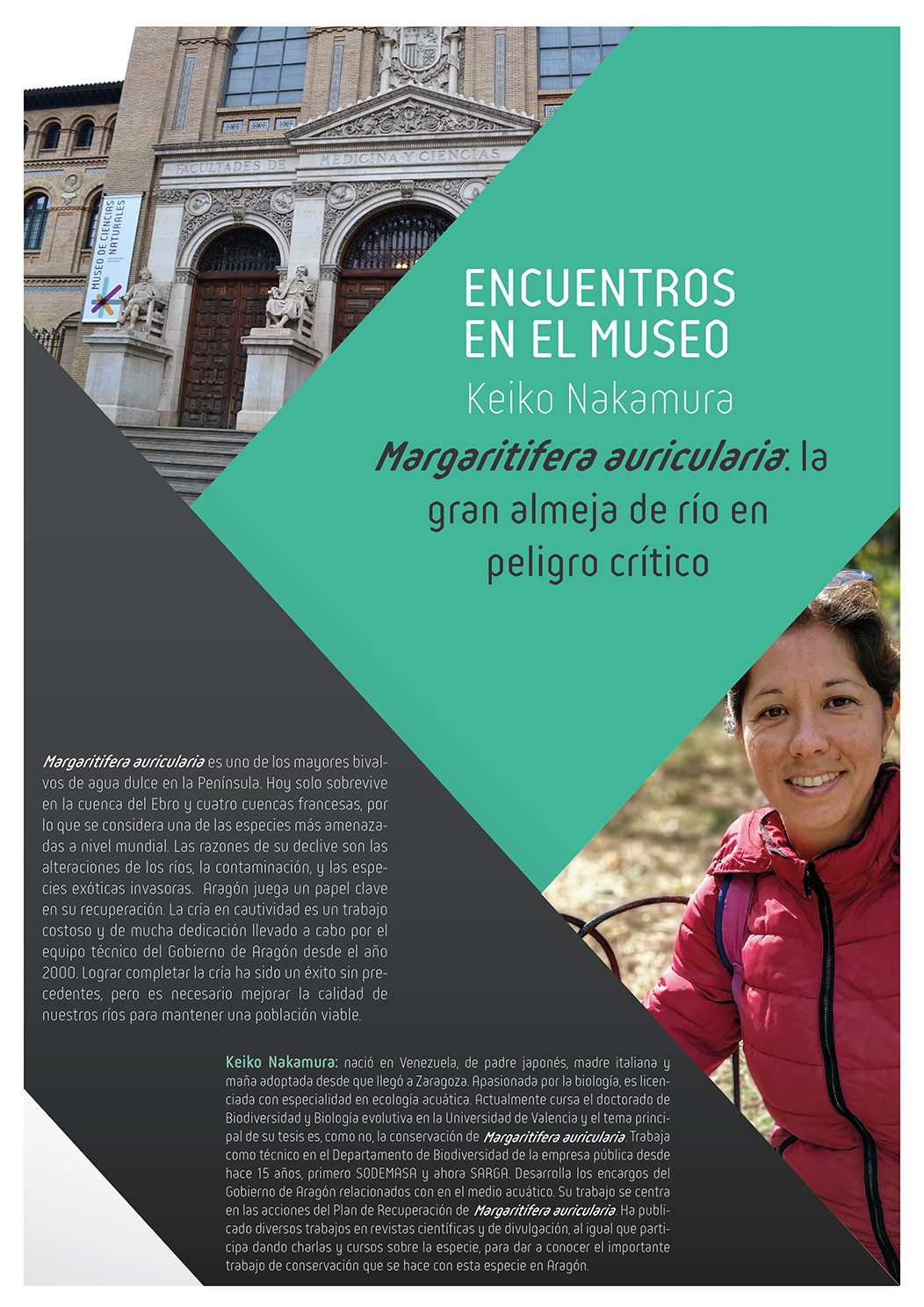 Keiko Nakamura nació en Venezuela, de padre japonés y madre italiana, aunque es maña adoptada desde que llegó a Zaragoza. Apasionada por la biología, es licenciada con especialidad en ecología acuática. Actualmente cursa el doctorado de Biodiversidad y Biología evolutiva en la Universidad de Valencia y el tema principal de su tesis es, como no, es la conservación de Margaritifera auricularia. Trabaja como técnico en el Departamento de Biodiversidad de la empresa pública desde hace 15 años, primero SODEMASA y ahora SARGA. Desarrolla los encargos del Gobierno de Aragón relacionados con en el medio acuático. Su trabajo se centra en las acciones del Plan de Recuperación de Margaritifera auricularia. Ha publicado diversos trabajos en revistas científicas y de divulgación, al igual que participa dando charlas y cursos sobre la especie, para dar a conocer el importante trabajo de conservación que se hace con esta especie en Aragón.