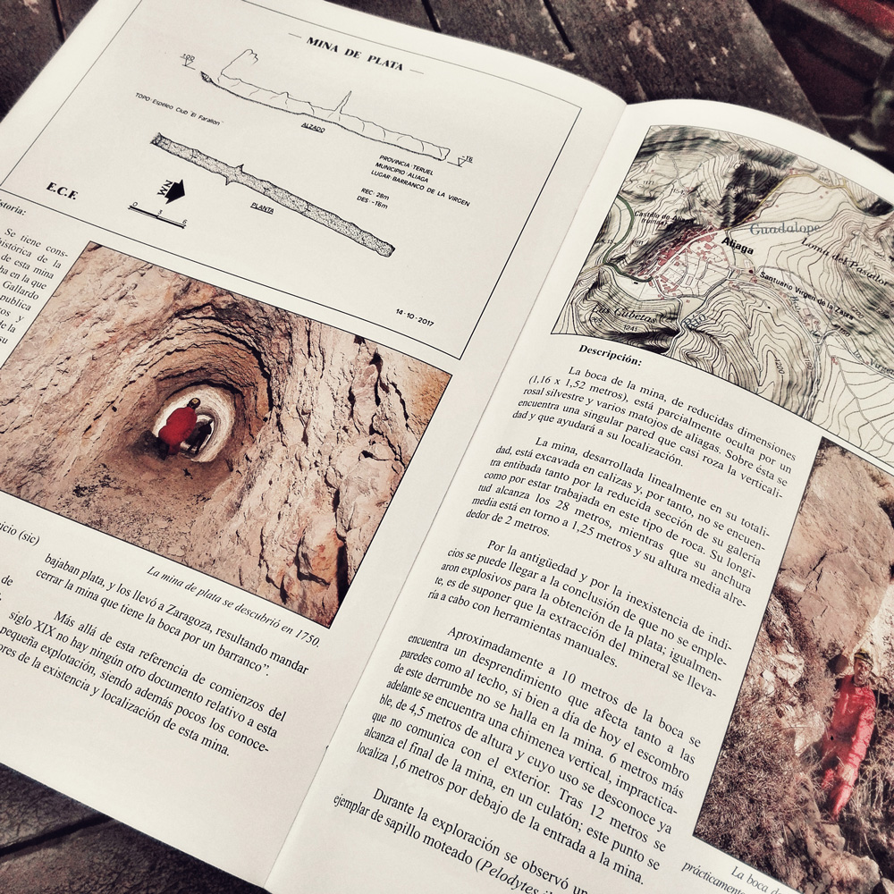 Hoy, como parte de nuestro proyecto de rescatar del olvido el patrimonio minero de Aragón, vamos a comentar una mina enigmática y bien olvidada. Gracias al último número de la revista Cija, de los compañeros del Espeleo Club El Farallón, de Montalbán, nos hemos enterado de que están explorando y cartografiando por primera vez esta mina. Se encuentra en el término municipal de Aliaga y tiene un recorrido de unos 28 metros en línea recta. En la foto se puede ver la revista Cija con las fotografías de esta mina.