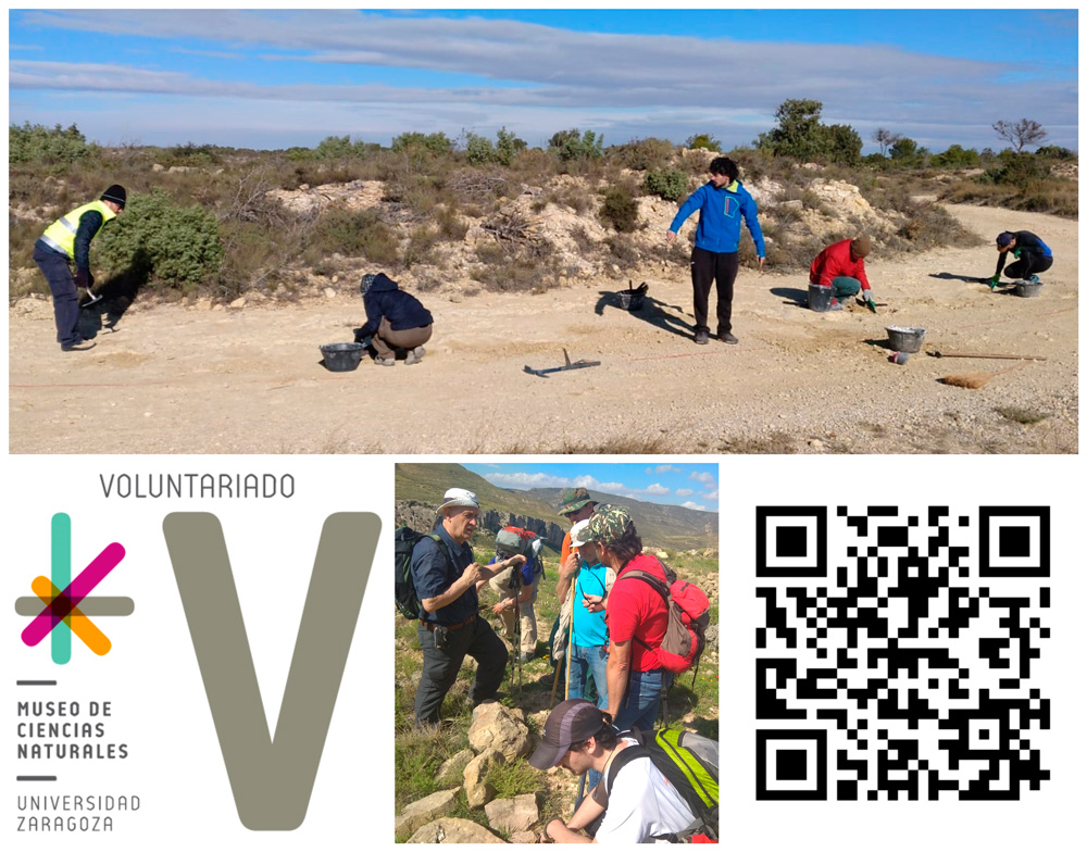 Parte superior: Voluntarios del Museo de Ciencias Naturales de la Universidad de Zaragoza realizando una primera limpieza de un yacimiento de, Zaragoza. Parte inferior central: Prospección paleontológica en una localidad turolense  A los lados de ésta: Logo de los Voluntarios y código QR de su página en Facebook.