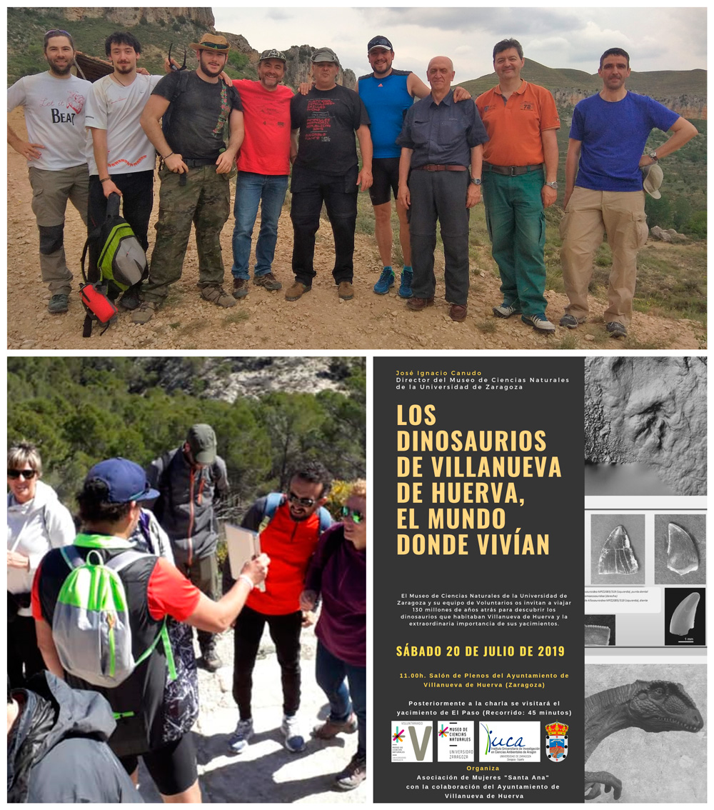 Parte superior: Equipo de voluntarios junto a los paleontólogos José Ignacio Canudo y Eduardo Medrano en Obón (Teruel). Parte inferior izquierda: Excursión organizada en La Puebla de Albortón para divulgar  los yacimientos de icnitas localizados en el municipio. Parte inferior derecha: Cartel informativo de la excursión y charla sobre los yacimientos de dinosaurios en Villanueva de Huerva (Zaragoza) impartida por el director del museo y organizada por los voluntarios